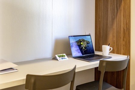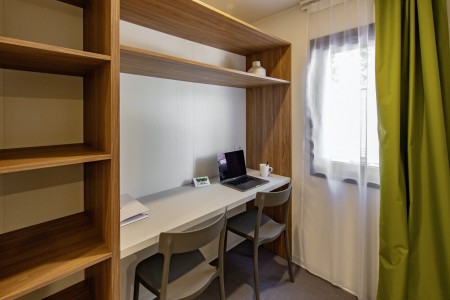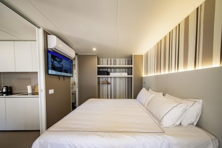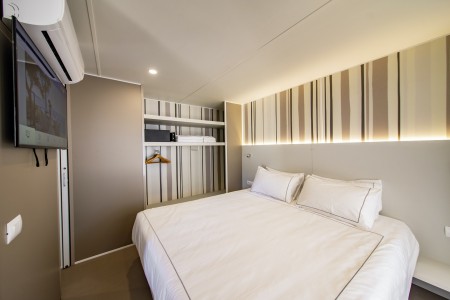 Deluxe camping villa for 4-5 people: approx. 57 m², one bedroom with double bed (180 x 200 cm), 43-inch Smart TV, private bathroom with shower, WC, hairdryer and toiletries. One bedroom with bunk beds (75 x 195 cm) or two single beds (80 x 200 cm) and en-suite bathroom with shower and WC. "Home office" area with desk and power sockets in the hallway, living room with sofa bed (80 x 185 cm) and Smart TV, electric radiators in the bathrooms and bedrooms, fully equipped kitchenette with fridge with freezer compartment, dishwasher, induction hob, microwave, kettle and Illy espresso machine, free WiFi internet, Smart TV, air conditioning, laptop-sized safe, covered terrace (17 m²) with sun loungers and seating area. Optionally bookable with panoramic sea view. Bed linen (changed every 4 days) and towels (changed every 2 days) included in the price.