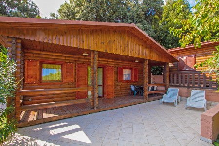 Mobile home for 4 people "Chalet": approx. 40 m², one bedroom with double bed, one bedroom with two single beds, two bathrooms with shower and WC, living/dining area with kitchenette (stove, fridge with freezer compartment, coffee machine), covered terrace with seating set and two sun loungers. Also air conditioning, satellite TV and WiFi internet (free of charge).