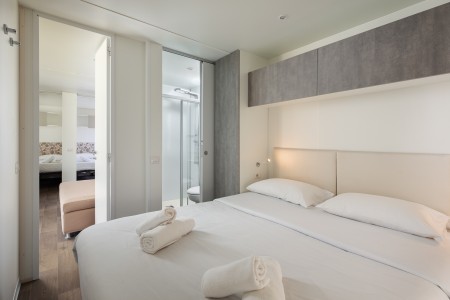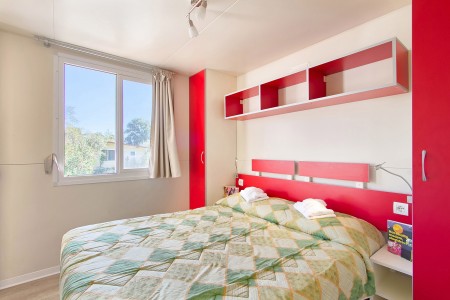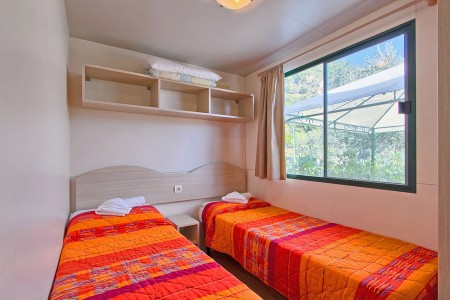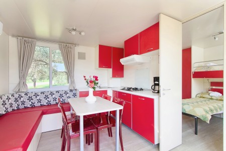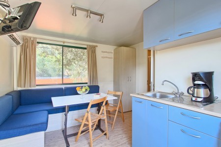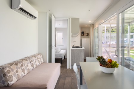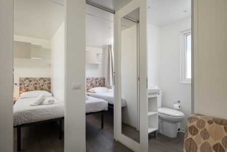 Mobile home for 4-5 persons "Comfort": approx. 30 m², one bedroom with double bed, one bedroom with two single beds and bunk bed (for children up to 9.99 years), two bathrooms with shower and WC, living/dining area with kitchenette (stove, fridge, coffee machine), terrace with seating set and two sun loungers. Also air conditioning, satellite TV and WiFi internet (free of charge).