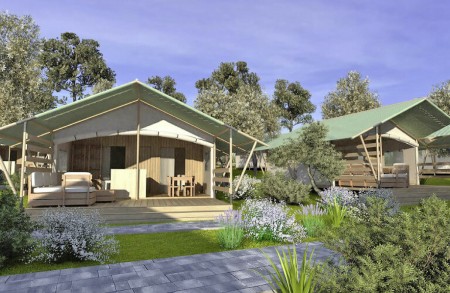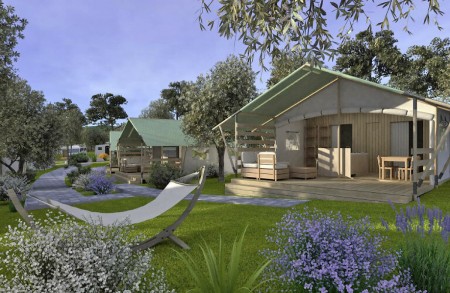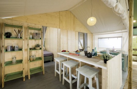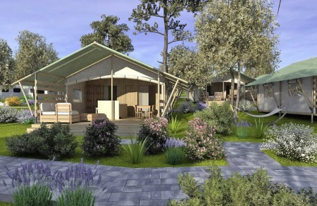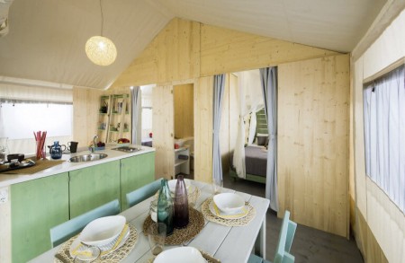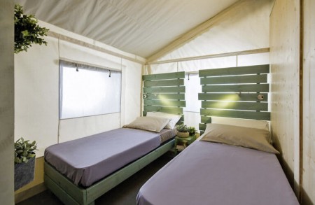 Relax glamping tent for 4 people: approx. 38 m², modern and furnished with natural materials, one bedroom with double bed (160 x 200 cm), one bedroom with two single beds (80 x 200 cm), living area with seating set for 4 people and kitchenette (induction stove, fridge with freezer compartment, microwave, Nespresso coffee machine, toaster), bathroom with shower/WC, covered terrace with lounge furniture for 4 people. Air conditioning, SAT-TV. Safe, WiFi internet available (free of charge). Also sun loungers for 2 persons, electric barbecue and hammock lounger.