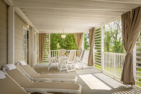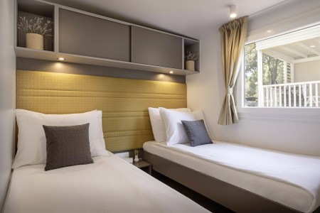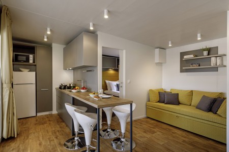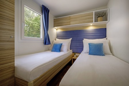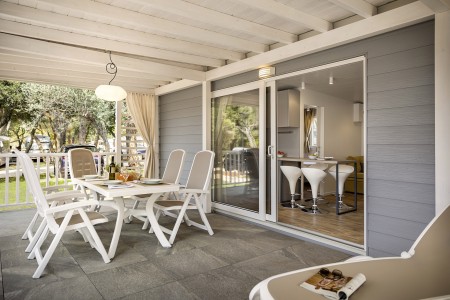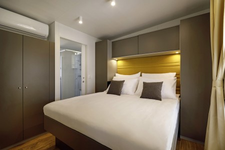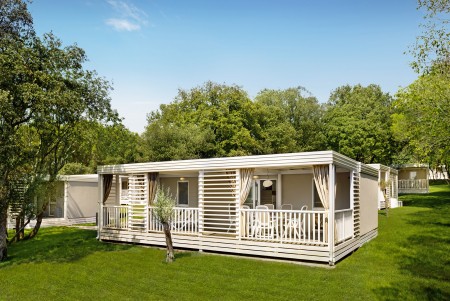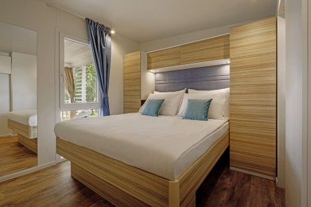 Mobile home "Standard" for 4-6 people: approx. 37 m², modern furnishings, one bedroom with double bed, one bedroom with two single beds, living room/bedroom with kitchenette (stove with 4 hobs, fridge with freezer compartment, dishwasher, microwave, filter coffee machine) and sleeping accommodation for two people (pull-out seating area 143 x 198 cm), two bathrooms with shower/WC, covered terrace with seating for 4 people and sun loungers for 2 people. WiFi internet available in the mobile home (free of charge). Also SAT-TV and air conditioning.