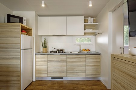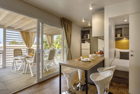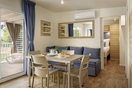 Mobile home "Family" for 6-8 people: approx. 41 m², modern furnishings, one bedroom with double bed, two bedrooms with two single beds each, living room/bedroom with kitchenette (stove with 4 hobs, fridge with freezer compartment, dishwasher, microwave, filter coffee machine) and sleeping accommodation for two people (pull-out seating area 143 x 198 cm), two bathrooms with shower/WC, covered terrace with seating for 6 people and sun loungers for 4 people. WiFi internet available in the mobile home (free of charge). Also SAT-TV and air conditioning.