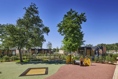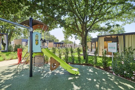Glamping tent for 4-5 persons: approx. 54 m², one bedroom with double bed (160x200 cm), one bedroom with two single beds, additional sleeping possibility for children up to 10.99 years on the gallery (120x200 cm) shower/WC, living room with dining area, kitchenette (sink, gas stove, fridge with freezer compartment, microwave, kettle, coffee machine, toaster), covered terrace with lounge furniture and two deckchairs. Also satellite TV, air conditioning and WiFi internet (free of charge).