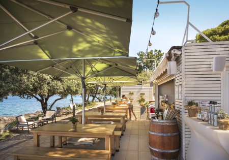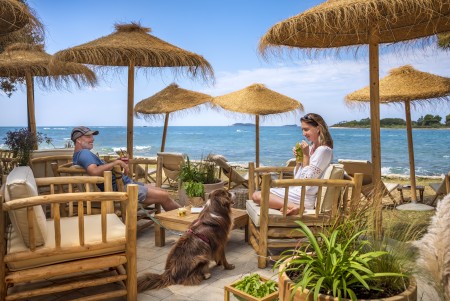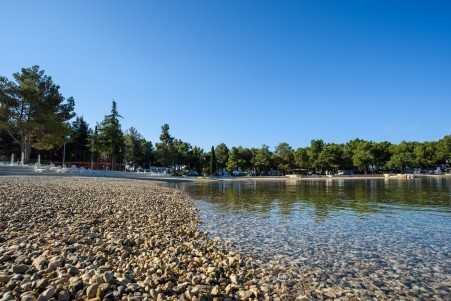Beach: The 3 km long rocky and pebbly beach with sandy sections, sunbathing areas, sports zone with various sports facilities and two beach bars is approx. 100-800 m away, depending on the accommodation. Sun loungers and parasols for a fee. The beach has been awarded the "Blue Flag", which stands for a clean, well-kept coastal area with excellent water quality. A dog beach (near the marina) is also available.