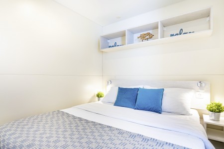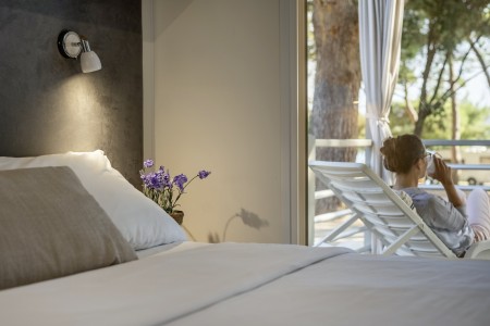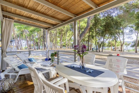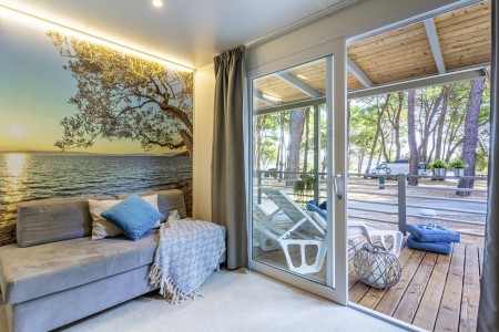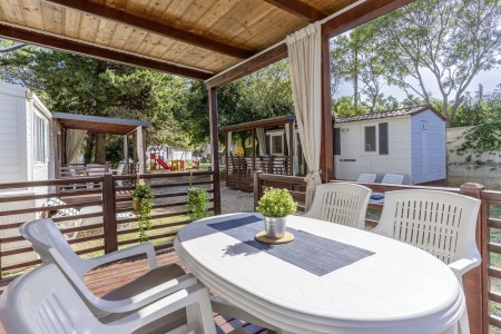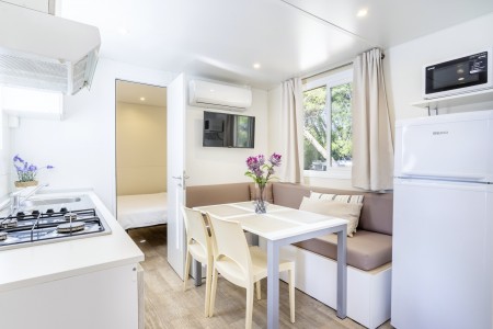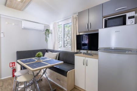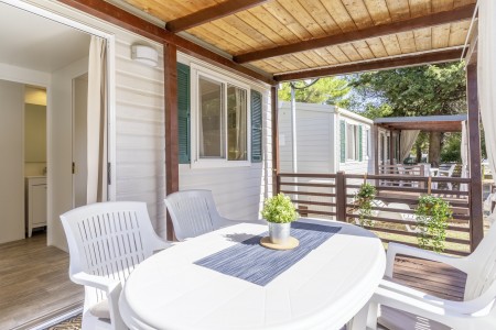 Mobile home "Superior Relax" for 4-5 persons: approx. 32 m², one bedroom with double bed (164x200 cm), one bedroom with two single beds (each 84x200 cm), living room with kitchenette (electric stove, microwave, fridge), dining area and sofa bed for an additional child up to 11.99 years, two bathrooms with shower and WC, covered terrace (approx. 24 m²) with seating area. Also SAT-TV and air conditioning.