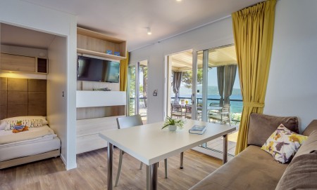 Mobile home "Lungomare Premium Parkside" for 4-6 people: approx. 32 m², one bedroom with double bed, one bedroom with two single beds, two bathrooms with shower/WC, living/dining room with sofa (sleeping accommodation for two children), dining table and fully equipped kitchenette (stove, microwave, coffee machine, kettle and fridge with freezer compartment). Covered terrace with garden furniture and two sun loungers. Also safe, satellite TV, WiFi internet (free of charge) and air conditioning.