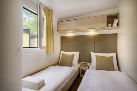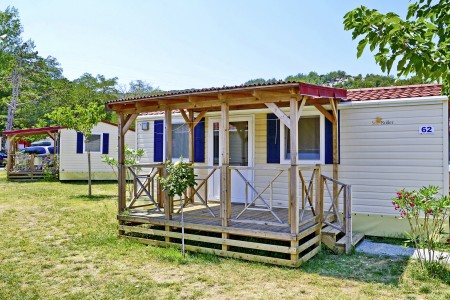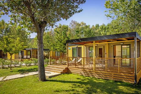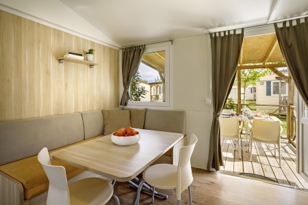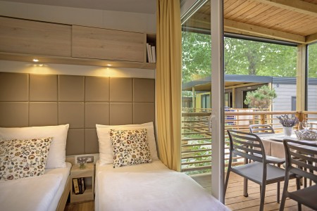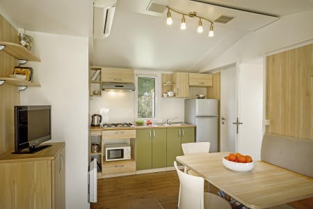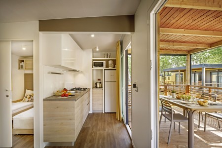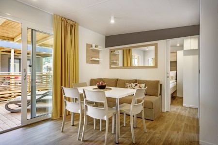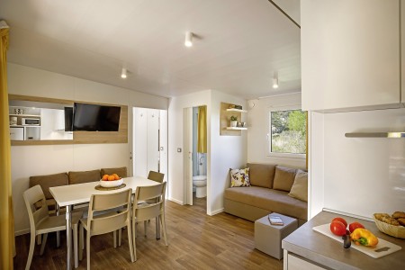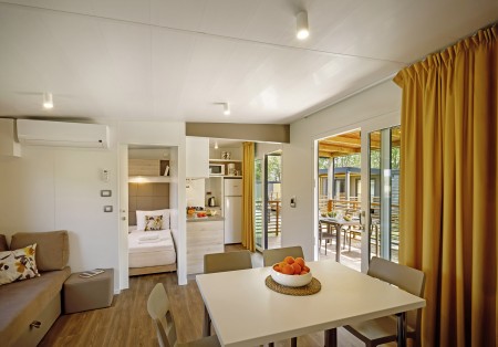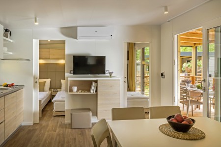Mobile home "San Marino Home" for 4-6 people: approx. 31 m², one double room with double bed (150 x 190 cm), one double room with two single beds (70 x 190 cm each). Living room/bedroom with kitchenette (stove with 4 hotplates, refrigerator, microwave, coffee machine) and sleeping accommodation for two children up to 11.99 years. Two bathrooms with shower/WC, covered terrace (approx. 10 m²) with seating set. Also WiFi Internet, air conditioning and satellite TV as well as a free parking space.