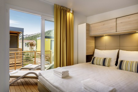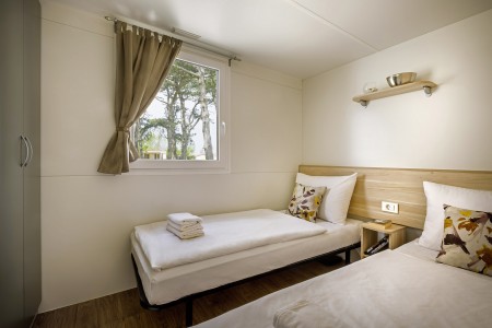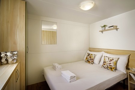 Mobile home "Lopar Garden Home" for 4-6 people: located in Lopar Garden Village. Modern and comfortably furnished, approx. 34 m², one double room with double bed (160 x 200 cm), one double room with two single beds (80 x 190 cm each). Living/sleeping area with kitchenette (stove with 4 hotplates, fridge, microwave, coffee machine) and sleeping accommodation for two children up to 11.99 years. Two bathrooms with shower/WC, spacious covered terrace (approx. 20 m²) with seating and two sun loungers. Also WiFi Internet, air conditioning and satellite TV as well as a free parking space.