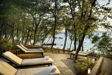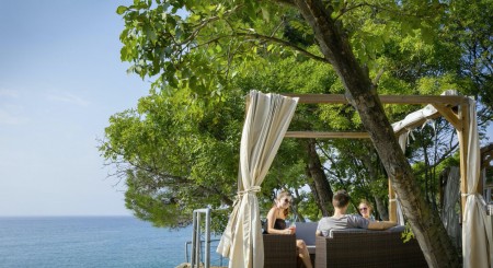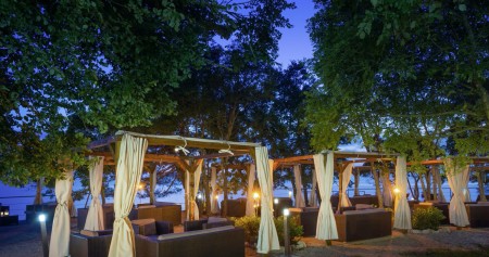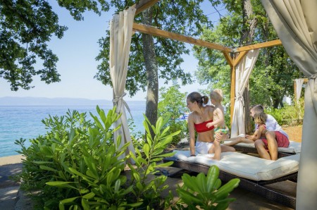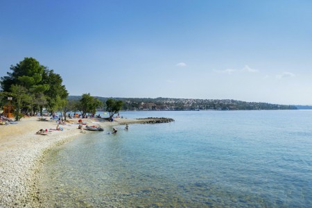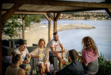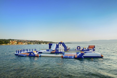 Beach: The 700 m long rocky and pebble beach with sun loungers and parasols (for a fee) and lounge bar is approx. 10-200 m away, depending on the accommodation. There is an inflatable water park in the sea for children. Dogs are allowed on a small part of the beach.