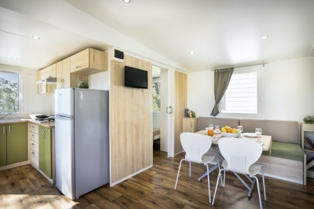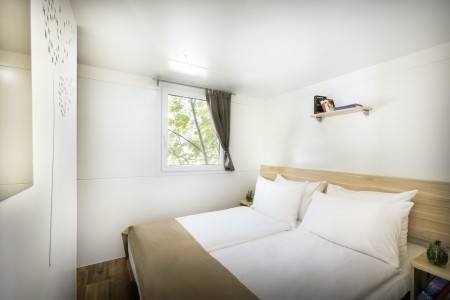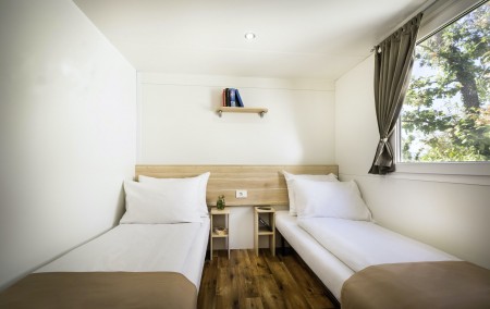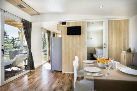Mobile home "Premium" for 4-5 persons: approx. 34 m², one bedroom with double bed, one bedroom with two single beds, two bathrooms with shower/WC, smart TV, air conditioning, living/dining area with pull-out sofa (sleeping possibility for one person, 90x180 cm) and a fully equipped and modern kitchen (induction hob, fridge, coffee machine, Nespresso machine, kettle, microwave, toaster and dishwasher) and a covered terrace (approx. 14 m²) with sun loungers and garden furniture.