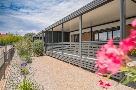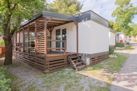 Mobile home "Salumbra Premium" for 4-5 people: approx. 30 m², air-conditioned, one bedroom with double bed, one bedroom with two single beds, bathroom with shower/WC, living room with sofa bed (140x200 cm), kitchenette (refrigerator with freezer compartment, electric stove, and kettle), dining table, satellite TV, bathroom/WC, furnished terrace (approx. 21 m²). dining table, satellite TV, bathroom/WC, furnished terrace (approx. 21 m²).