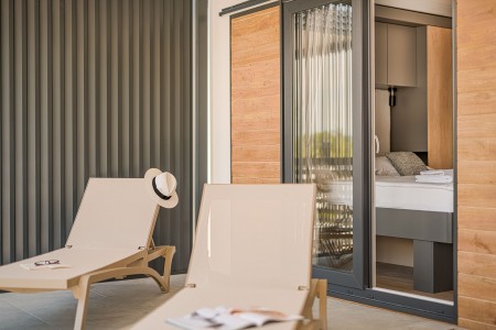 Mobile home "Salumbra Premium Relax" for 4-5 people: approx. 30 m², air-conditioned, one bedroom with double bed, one bedroom with two single beds, bathroom with shower/WC, living room with sofa bed (190x80 cm), kitchenette (refrigerator, electric stove, and kettle), dining table, satellite TV, bathroom/WC, furnished terrace (approx. 21 m²) with two sun loungers and sea view. dining table, satellite TV, bathroom/WC, furnished terrace (approx. 21 m²) with two sun loungers and sea view.