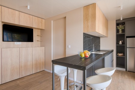 Mobile home "Selce Studio" for 7 people: approx. 40 m², air-conditioned, one bedroom with double bed, one bedroom with two single beds, one bedroom with bunk beds, two bathrooms with shower/WC, living room with sofa bed (135x190 cm), kitchenette (refrigerator, electric stove, dishwasher, and kettle), dining table, satellite TV, bathroom/WC, furnished terrace (approx. 36 m²). kitchenette (refrigerator, electric stove, dishwasher, and electric kettle), dining table, satellite TV, bathroom/WC, furnished terrace (approx. 36 m²).