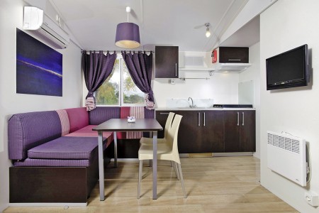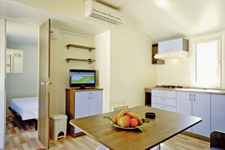 Mobile home "Family Luxury" for 6-7 people: approx. 40 m², modern furnishings, one bedroom with double bed (160 x 200 cm), two bedrooms each with two single beds (80 x 190 cm each), living room with kitchenette (fridge, microwave, stove, dishwasher) and dining area with sofa bed for a child up to 11 years, bathroom with shower/WC, separate WC, covered terrace with seating set. Also air conditioning, and SAT-TV and view of the marina and campsite.