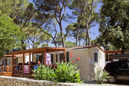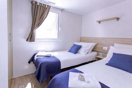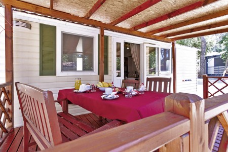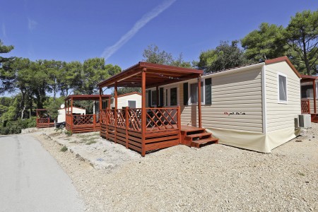 Mobile home "Dalmacija" for 4-6 persons: approx. 32 m², one bedroom with double bed (140x190 cm) and shower/WC, one bedroom with two single beds (each 70x190 cm) and shower/WC, living room with sleeping accommodation for two persons (corner bench 135x190 cm) and kitchenette with coffee machine, covered terrace (approx. 24 m²) with seating area. Also WiFi Internet (free of charge), SAT-TV and air conditioning. Distance to the beach approx. 200-400 m.