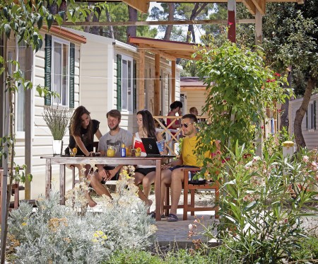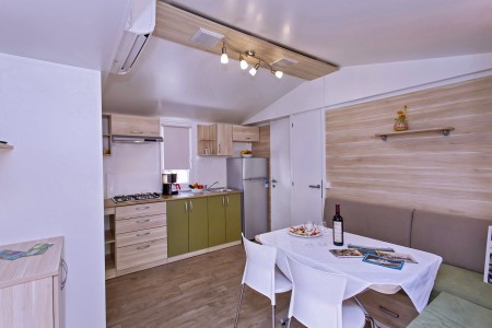 Mobile home "Premium Family" for 4-6 persons: approx. 32 m², one bedroom with double bed (140x190 cm) and shower/WC, one bedroom with two single beds (each 70x190 cm) and a bunk bed as well as shower/WC, living room with sleeping accommodation for one person (corner bench 135x190 cm) and kitchenette with coffee machine, covered terrace (24 m²) with seating area. Also WiFi Internet (free of charge), satellite TV and air conditioning. The Premium Family mobile homes are located near the children's playground. Distance to the sea approx. 300 m.