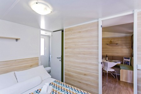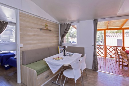 Mobile home "Dalmacija Plus" for 4-6 persons: approx. 32 m², one bedroom with double bed (140x190 cm) and shower/WC, one bedroom with two single beds (80x190 cm) and shower/WC, living room with sleeping accommodation for two persons (corner bench 130x190 cm) and kitchenette with coffee machine, covered terrace (24 m²) with seating area. Also WiFi Internet (free of charge), SAT-TV and air conditioning. Distance to the sea approx. 300 m.