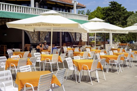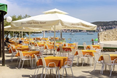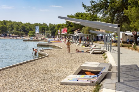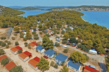 The campsite is located on the island of Murter in a sheltered bay with 500 meters of pebble beach that gently slopes into the crystal-clear sea. In addition to excellent conditions for a relaxing beach vacation with the family, Murter also offers numerous opportunities for exciting excursions, whether on the island itself or on the mainland, with which the island is connected by a bridge. The lively resort of Vodice is just 12 km away, while the historic coastal town of Šibenik and the Krka National Park with its breathtaking waterfalls are also within easy reach by car. The Kornati National Park with its unique island paradise is also not far away.