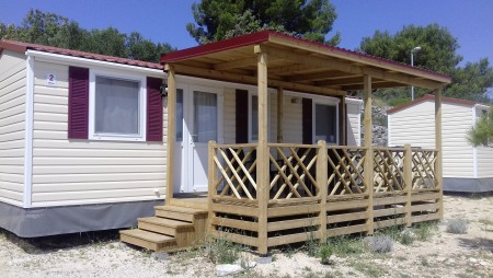 Mobile home "Lux" for 4-6 people: approx. 24 m², one bedroom with double bed, one bedroom with two single beds. Living room/bedroom with kitchenette (stove with 4 hobs, fridge with freezer compartment, microwave, kettle) and sleeping accommodation for two people, bathroom with shower and WC, covered terrace (approx. 9-14 m²) with seating. Also air conditioning and a parking space at the mobile home. No television.
