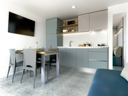 Mobile home "Family Premium" for 6-7 persons: approx. 33 m², one bedroom with double bed, two bedrooms with two single beds, two bathrooms with shower/WC, living room/bedroom with dining area and fully equipped kitchen (dishwasher, stove, fridge, microwave, kettle, coffee machine, Nespresso machine) and additional sleeping accommodation for a child up to 11.99 years, terrace with table and six chairs, two sun loungers and parasol. Also SAT-TV, safe and air conditioning.
