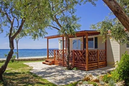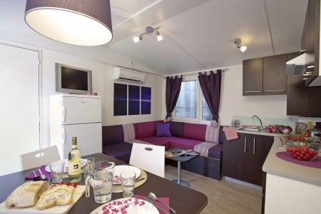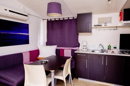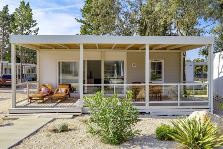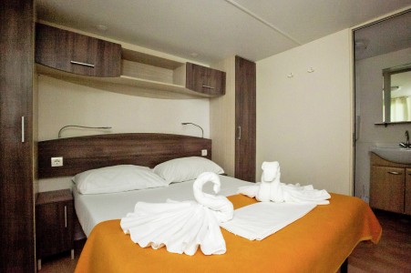 Mobile home "Mediteran" for 4-6 persons: approx. 34 m², two double rooms, living room with sleeping accommodation, dining area and kitchenette with microwave and coffee machine, two bathrooms with shower and shower and WC, terrace with seating and two sun loungers. Also SAT-TV and air conditioning. Bookable for 4 adults and 2 children up to 11.99 years. The distance to the sea is approx. 150 m.