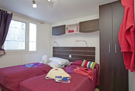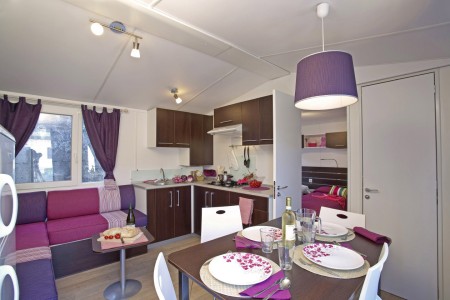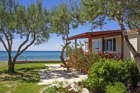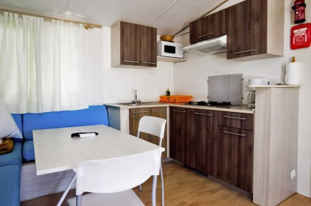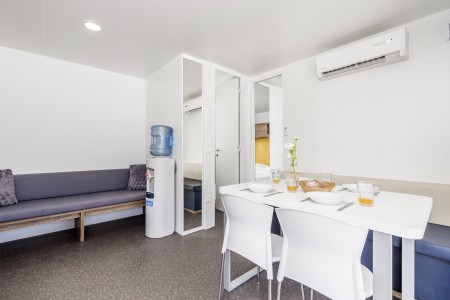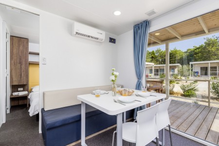 Mobile home "Adria" for 4-5 persons: approx. 34 m², two double rooms, living room with sleeping accommodation, dining area and kitchenette with microwave and coffee machine, two bathrooms with shower and WC, terrace with seating set and two sun loungers. Also SAT-TV and air conditioning. Bookable for 4 adults and 1 child up to 11.99 years. The mobile homes "Adria" are located near the pool area, approx. 50-100 m from the sea.