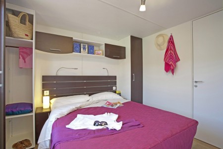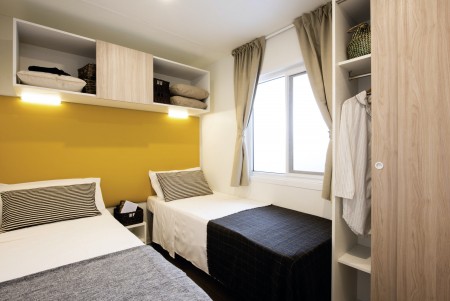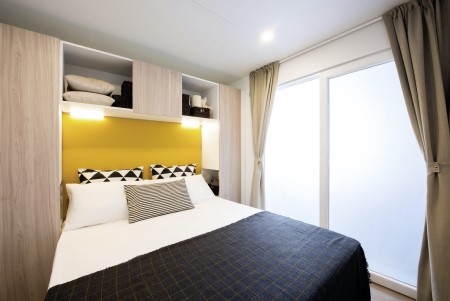 Mobile home "Premium" for 4-5 people: approx. 34 m², two double rooms, living room with sleeping accommodation, dining area and kitchenette with microwave and coffee machine, two bathrooms with shower and WC, terrace with seating set and two sun loungers. Also SAT-TV and air conditioning. Bookable for 4 adults and 1 child up to 11.99 years. The "Premium" mobile homes are located near the playground and beach.