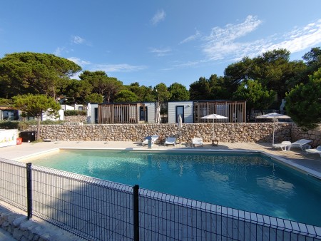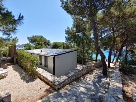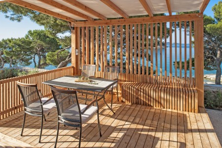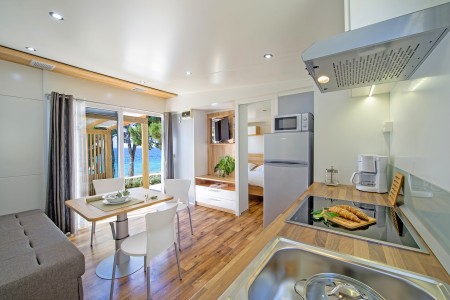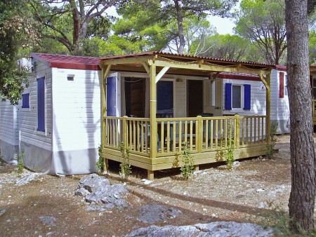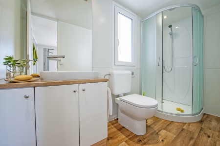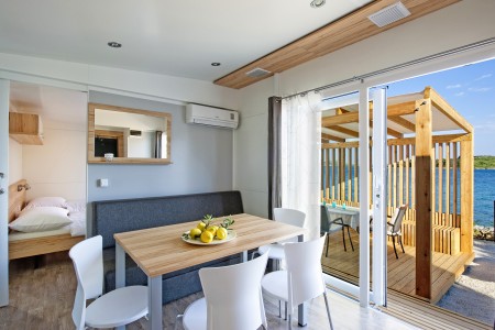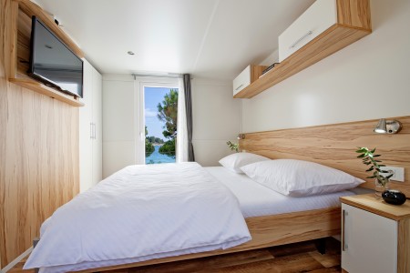 Mobile home "Superior" for 4-5 persons: approx. 36 m², stylish and modern furnishings, located in the car-free "Adria Village" area. One double room with double bed, one double room with two single beds, two bathrooms with shower/WC, living room/bedroom with sitting area (sleeping accommodation for 1 child up to 12 years), dining table and kitchenette with stove, fridge, microwave and coffee machine. Private garden plot and large covered terrace with seating area, sunshade and two comfortable sun loungers, outdoor shower and barbecue. Also WiFi Internet (free of charge), SAT-TV and air conditioning. Access to the private swimming pool, which is only available to guests of the superior mobile homes. Parking outside the car-free area (1 parking space per mobile home free of charge).