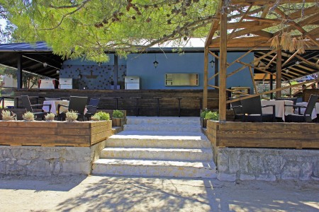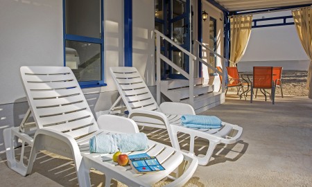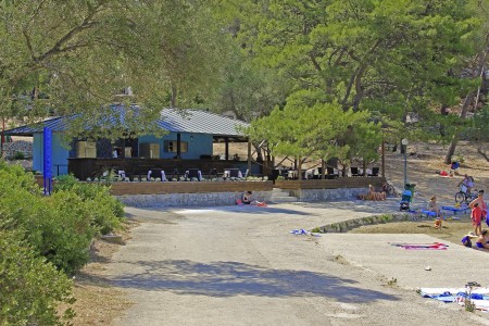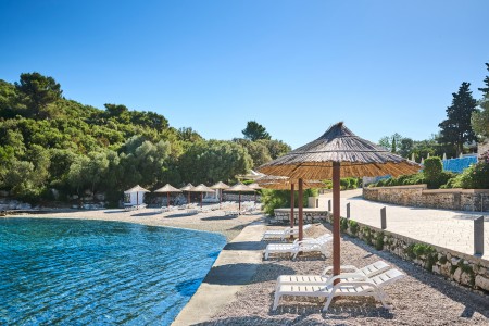 Beach: The rocky and fine gravel beach with sandy sections, sunbathing areas, taverna and barbecue bar is approx. 250 m away, depending on the accommodation. Sun loungers and parasols for a fee. Inflatable water park for children in the sea.