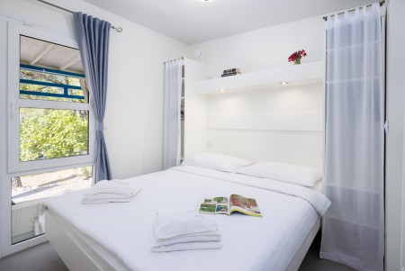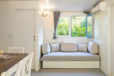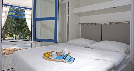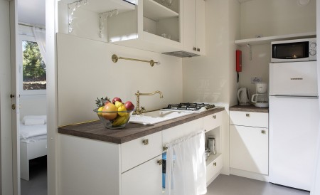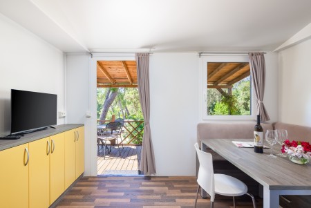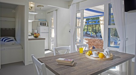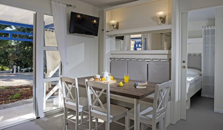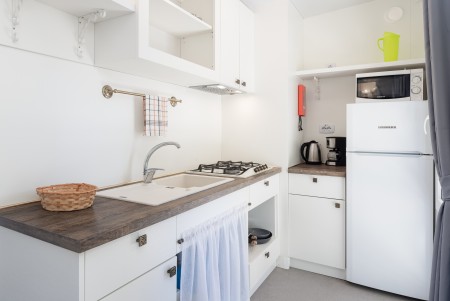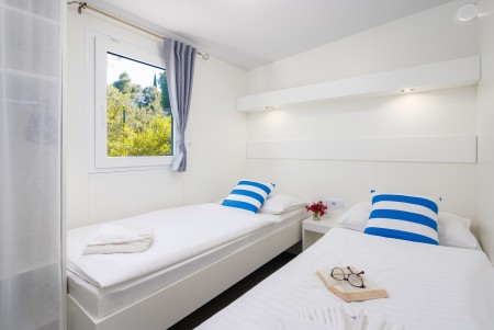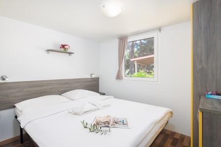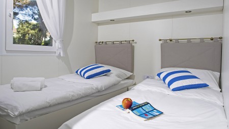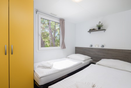 Mobile home Port9 for 4-6 people: approx. 32 m², living room with kitchenette (gas stove with 4 hobs, microwave, fridge with freezer compartment, coffee machine, kettle), dining table and sleeping accommodation (pull-out seating area 122x189 cm) for two people, one bedroom with double bed, one bedroom with two single beds, two bathrooms with shower and WC, covered terrace with seating set. Also WiFi Internet (free of charge), SAT-TV and air conditioning. Free parking at the mobile home for 1 car.