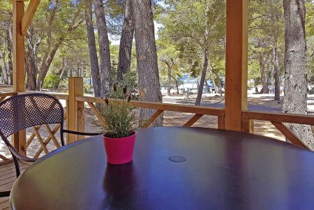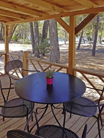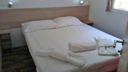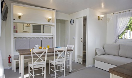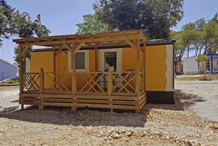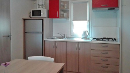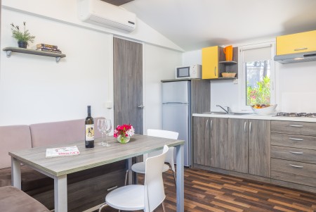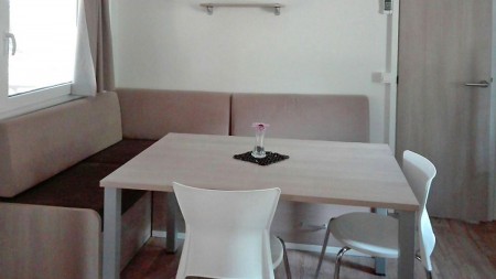 Mobile home Marco Polo Village for 4-6 people: approx. 35 m², modern furnishings, living room with kitchenette (gas stove with 4 hobs, fridge with freezer compartment, microwave, coffee machine, kettle), dining area and sleeping accommodation (pull-out couch 122x189 cm) for two people, one bedroom with double bed, one bedroom with two single beds, two bathrooms with shower and WC, covered terrace with seating set and two sun loungers. Also WiFi Internet (free of charge), SAT-TV and air conditioning. Free parking at the mobile home for 1 car.