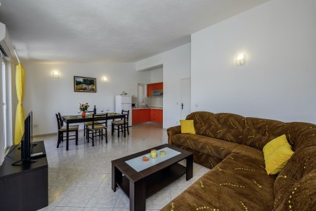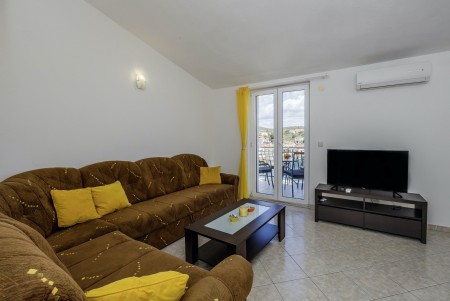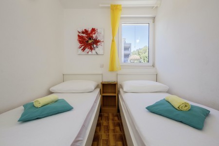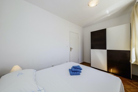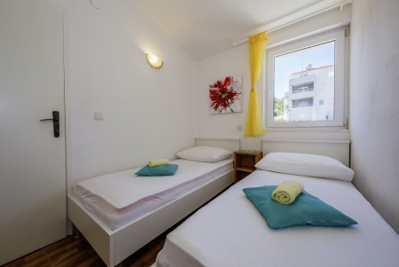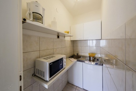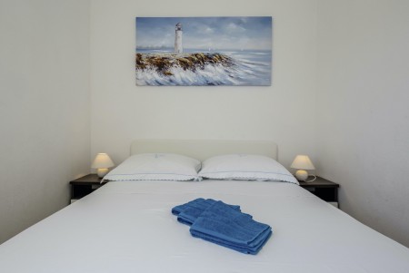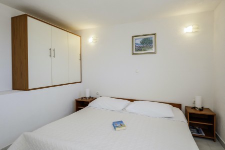 Apartment for 4 persons AP2: approx. 54 m² in the attic. One bedroom with double bed, one bedroom with two single beds, one bathroom with shower, washing machine, living room with sofa, air conditioning, kitchenette with stove, microwave oven and electric kettle, balcony with sea view and two rocking sun loungers.