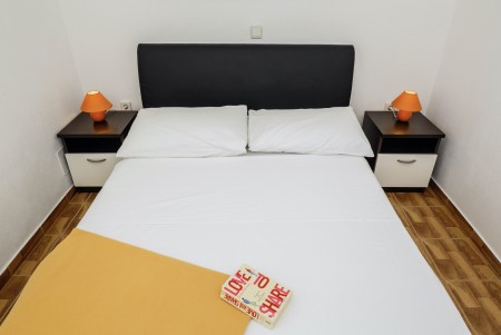 Apartment for 4 persons AP1: approx. 52 m² on the second floor. A bedroom with double bed, a bedroom with two single beds, a bathroom with bathtub and washing machine, living room with air conditioning, mini kitchen with stove, microwave oven and electric kettle, balcony with sea view and two rocking sun loungers.