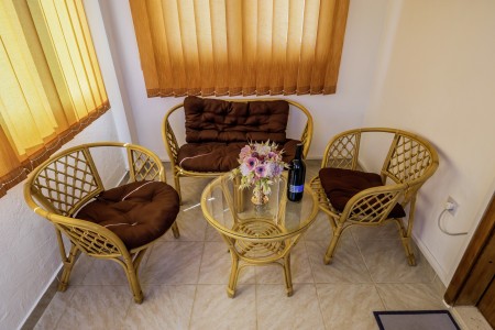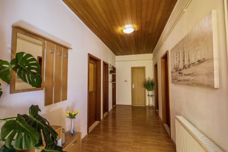 Apartment for 6-7 persons: approx. 100 m², located on the first floor with separate entrance. The spacious apartment offers a bright living/dining area with air conditioning, fully equipped kitchen with a sofa, and balcony overlooking the garden. Furthermore, one bedroom with a double bed, one bedroom with two single beds, one bedroom with double bed and an extra bed (suitable for one child up to 11,99 years), as well as two bathrooms with shower.