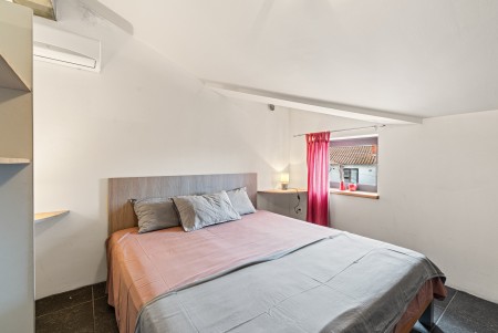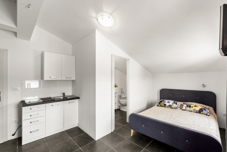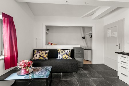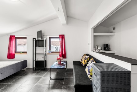 1 studio for 2–3 persons ST1: approx. 35 m², on the second floor. Combined living and sleeping area with air conditioning, double bed, sofa bed for one child up to 15,99 years old, kitchenette and dining area, as well as a bathroom with a shower.