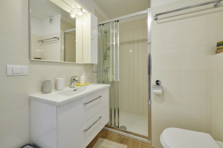 Apartment for 4-5 persons: approx. 80 m² on the first floor. The apartment comprises a kitchen with air conditioning opening onto the balcony (approx. 10 m²) with seats, a living room with air conditioning and sofa bed (130 x 200 cm), one bedroom with double bed, one bedroom with two single beds, a bathroom with shower and bidet, and a bathroom with shower.