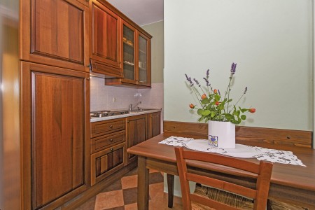 Apartment for 2 persons AP1: approx. 50 m², located on the ground floor. The apartment comprises a double bedroom, a living room with sofa, a kitchenette with microwave oven, dishwasher and dinette, and a bathroom with shower. Furthermore, there is a terrace with direct access to the beautiful yard.