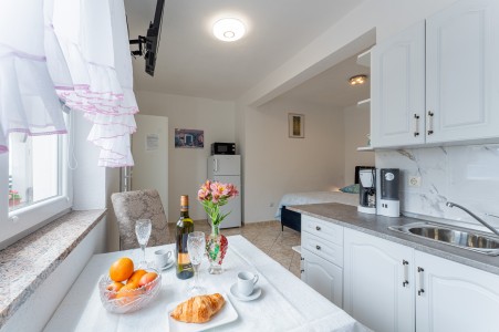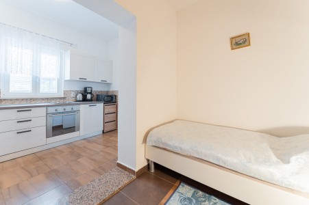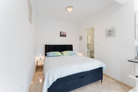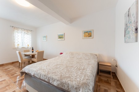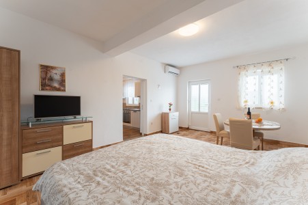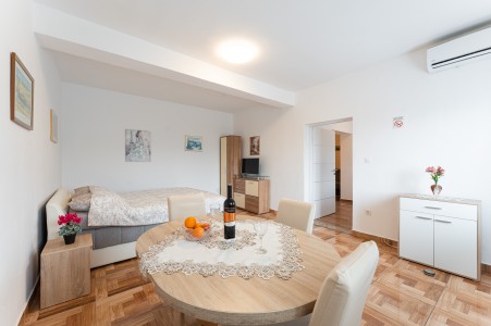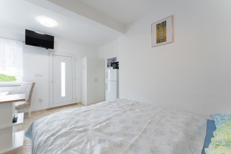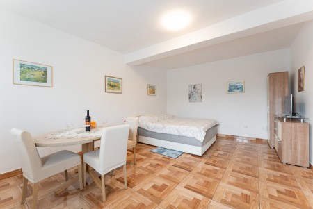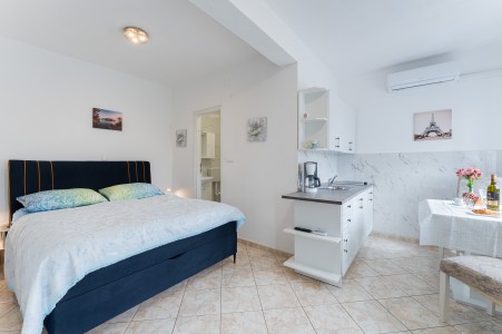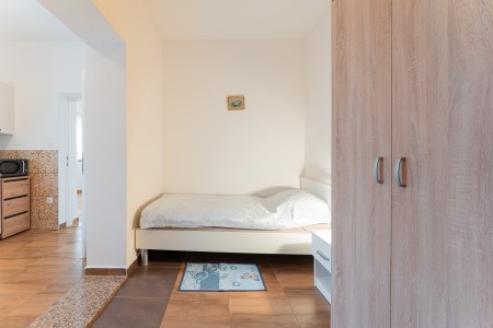 Studio apartment for two persons: approx. 27 m² on the first floor, with private entrance. Living/bedroom with air conditioning, double bed, kitchenette and dining table, bathroom with shower, large terrace (approx. 30 m²) with sea view.