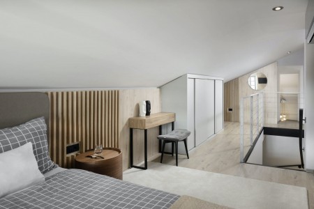 Apartment for 2 persons: approx. 55 m², situated on the second floor and spread across two levels. The lower level of this modern and comfortably furnished apartment features a luminous living area equipped with air conditioning, a cozy sofa, a fully-equipped kitchen, and a dining space. Additionally, there is a bathroom with shower. The upper level houses a bedroom furnished with a double bed, air conditioning, and a tv.