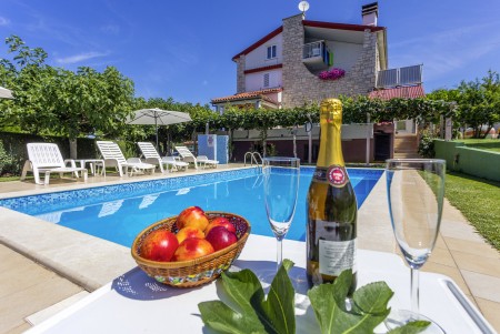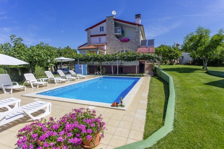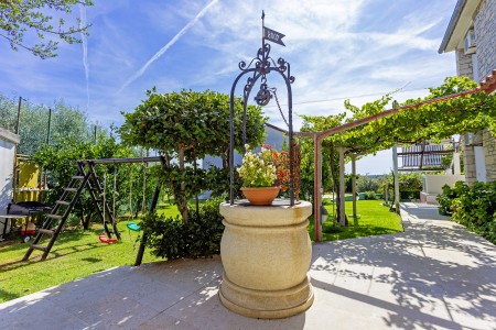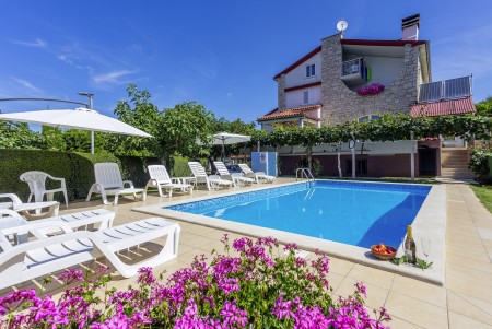 The apartment house is located within walking distance to the bustling center of Medulin, which offers many tourist attractions, family friendly beaches, and numerous possibilities to enjoy the Mediterranean atmosphere by day and night. The house comes with six accommodation units and a secluded backyard with well-kept lawns and a freshwater swimming pool (8 x 4 m). The pool is framed by a sun terrace with loungers and an outdoor shower.