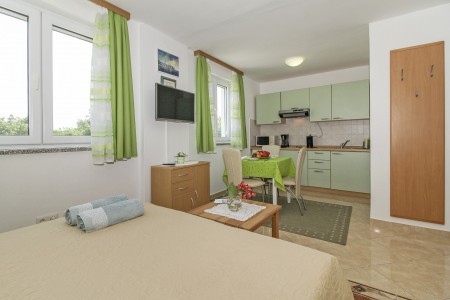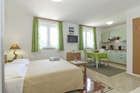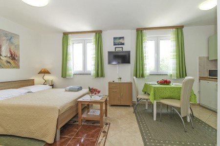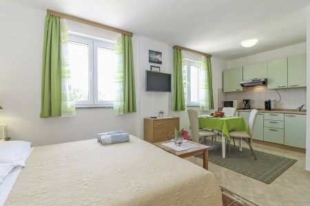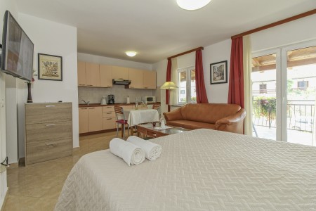 1 Studio for 2 persons ST1: The studio comes with a living space of approx. 25 m², located on the first floor. There is a living area including a double bed (160 x 200 cm), a kitchenette with dining table and air conditioning as well as a bathroom with a shower. A covered balcony with seating rounds off the offer. This is an adults-only accommodation.