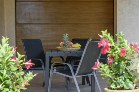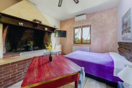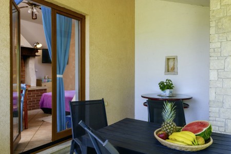 Studio apartment for 2 persons: approx. 30 m² on the ground floor, with private entrance and private terrace (about 20 m²). Living/bedroom with double bed, air conditioning and kitchenette, bathroom with shower.