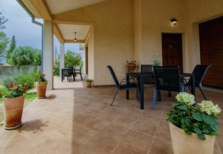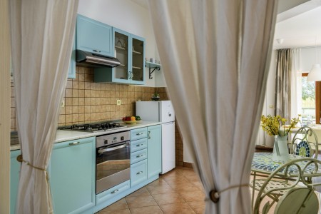 Apartment for 4-5 persons: approx. 75 m² on the ground floor, with private entrance and private terrace (about 35 m²). Fully equipped kitchen, living room with air conditioning, dining area and sofa bed (90 x 200 cm), two bedrooms with double bed and a bathroom with shower and washing machine.