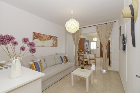 Apartment for 2 persons: approx. 45 m², located on the first floor, private entrance. The apartment is modernly furnished, and has a living area with fully equipped kitchen and couch as well as air conditioning and a dining table. The kitchen opens onto a balcony with seating set. Furthermore, there is one bedroom with double bed and a bathroom with shower.