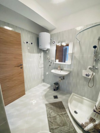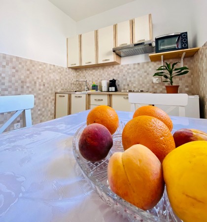 Apartment for 2–3 persons AP2: approx. 50 m², located on the second floor. Consists of a living room with a sofa bed suitable for one person, a kitchenette with dining area, air conditioning and access to the balcony, a bedroom with a double bed, and a bathroom with shower.