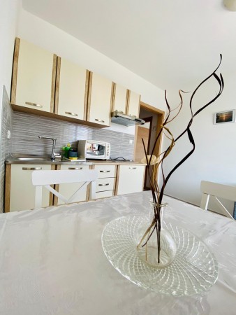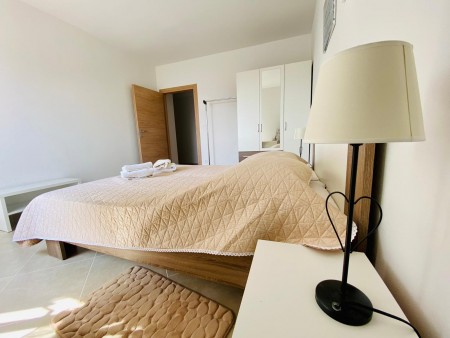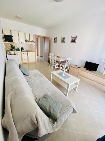 Apartment for 2–3 persons AP1: approx. 55 m², located on the second floor. Consists of a living room with a kitchenette and dining area, air conditioning and access to the balcony, a bedroom with a double bed and an extra bed suitable for a child up to 11,99 years, and a bathroom with shower.
