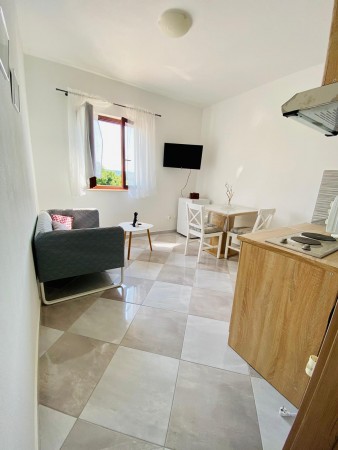 Apartment for 2 persons AP3: approx. 35 m², located on the second floor. Consists of a living room with kitchenette and dining area, air conditioning, a bedroom with a double bed, and a bathroom with shower.