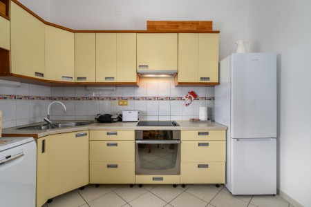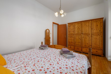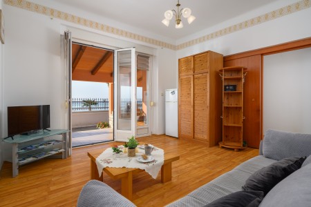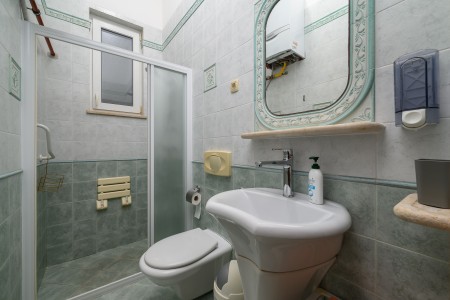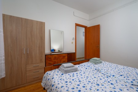 Apartment for 6-8 persons: approx. 100 m², on the ground floor. Fully equipped kitchen with dining table and air conditioning, living room with a sofa bed (160 x 200 cm) for two people and access to the covered terrace with sea view. The apartment includes three bedrooms, each furnished with a double bed. The third bedroom stands out with its terrace access and sea view. Additionally, there are two bathrooms with shower.