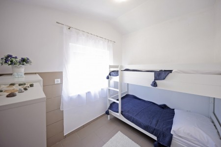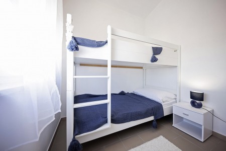 Apartment for 6 persons AP2: approx. 110 m² on the third floor, living/dining area with air conditioning, TV, comfortable couch and fully equipped kitchen, one bedroom with king-size bed as well as air conditioning and TV, one bedroom with two single beds, one bedroom with bunk bed, one bathroom with shower and WC, one bathroom with bathtub and shower, a separate WC, two balconies with views of the pool and the sparkling sea.