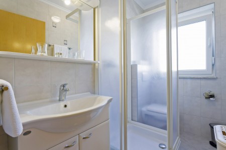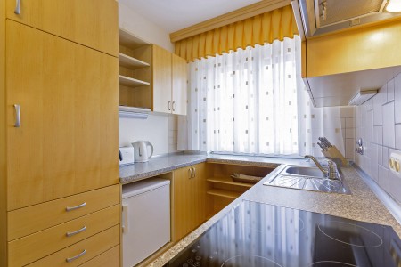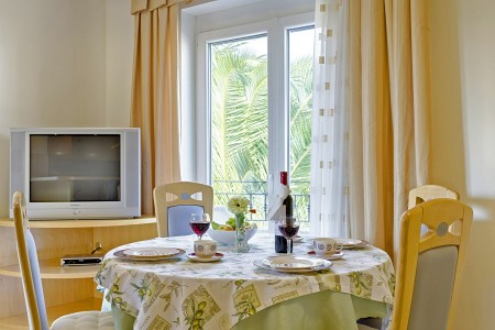 1 apartment for 2-4 persons AP3: approx. 48 m² on the first floor, air conditioning, one bedroom with double bed and balcony with sea view, bathroom with bathtub and washing machine, living area with sofa bed and balcony with sea view, safe, kitchen with oven, microwave and dishwasher, dining table. There are shutters and mosquito nets on all windows and balcony doors.